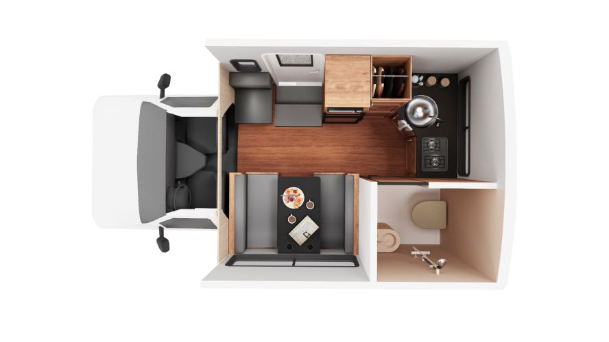 Features of the C-19 RV include an internal walk-through acces, a toilet, shower, airconditioning, oven/microwave and cruise control.