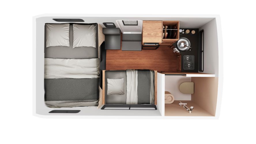 This RV offers sleeping capacity for max. 3 people (2 adults and a small child) with one double bed and one dinette bed. With a total length of 20 feet this small RV offers enough comfort for a couple or family with 1 child and is able to easily maneuver in to any campsite.