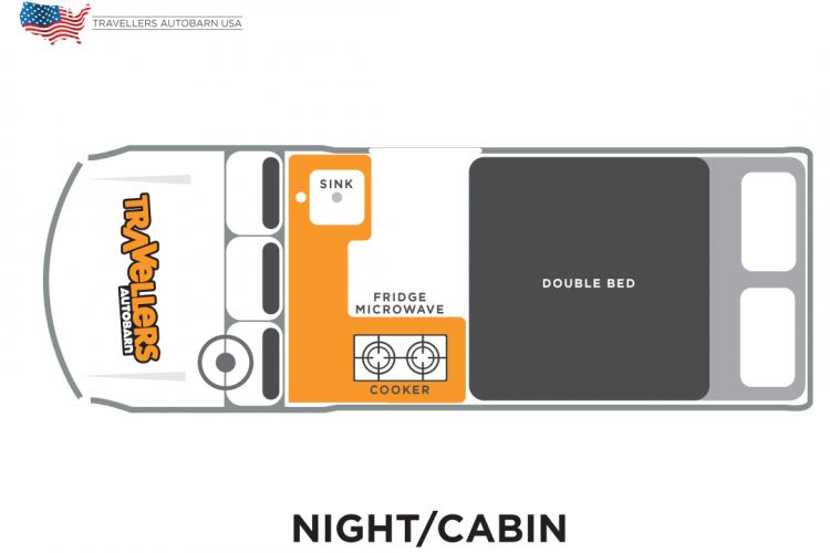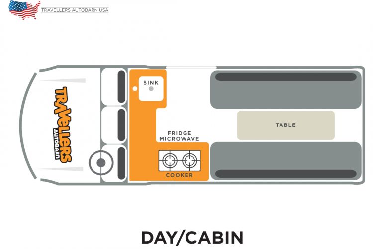 The HiTop campervan of RV supplier Travellers Autobarn is suitable for 3 people. This campervan offers sleeping capacity for max. 3 people with one double bed and an overcab bed. This campervan is suitable for children aged 4 years and up. With a total length of 5.6 meters, this campervan offers enough comfort for a small family or friends and is able to easily manoeuvre into any campsite. Features of the HiTop campervan include a kitchen with a fridge, stove and microwave, extra storage space under the seats and airconditioning.