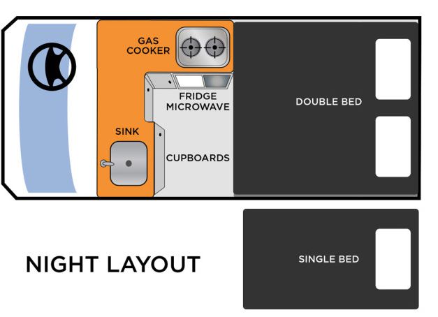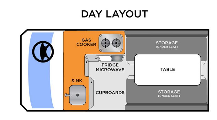 The Kuga campervan of RV supplier Travellers Autobarn is suitable for 3 people. This campervan offers sleeping capacity for max. 3 people with one double bed and an overcab bed. This self-contained campervan is suitable for children aged 4 years and up. With a total length of 5 meters, this campervan offers enough comfort for a small family or friends and is able to easily manoeuvre into any campsite. Features of the Kuga campervan include a kitchen with a fridge, stove and microwave, extra storage space under the seats and airconditioning.